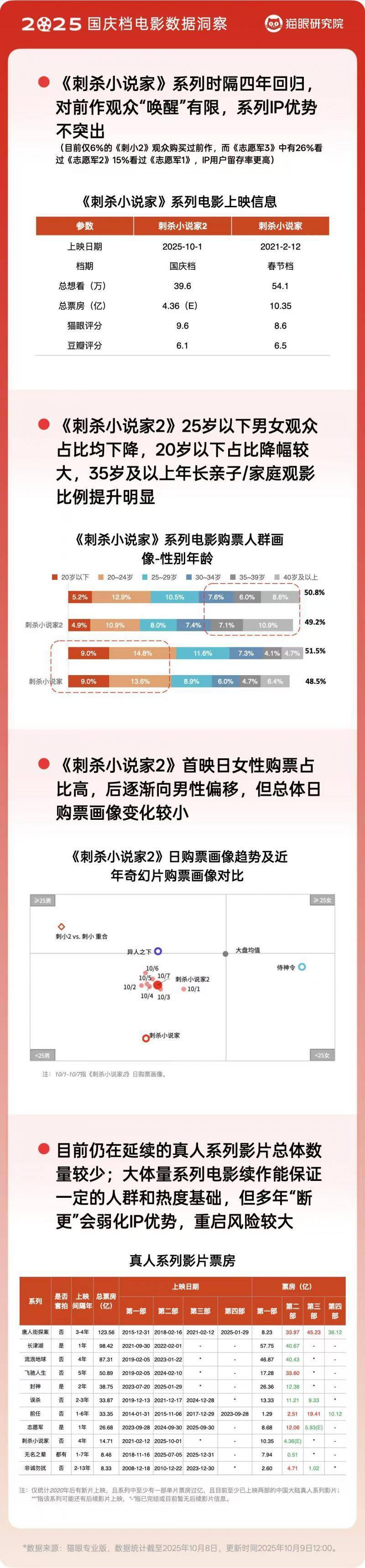 从单片表现来看,由于新片整体热度一般,档期内无影片票房破5亿。两部IP续作成今年国庆档新片票房主力:《志愿军:浴血和平》以4.50亿的档期票房成绩领跑,表现相对稳健;奇幻动作片《刺杀小说家2》档期内收获2.95亿票房,位列新片第二。从市场反馈来看,大体量系列电影续作能保证一定的人群和热度基础,但如果上映间隔时间较长则会削弱IP的系列优势。如《刺杀小说家2》与前作时隔四年,未能大比例唤醒前作观众的观影热情,IP用户留存率远不及“志愿军”系列。此外,老片中《731》凭借其题材和热度,档期内表现坚挺,位居整个国庆档票房亚军。
